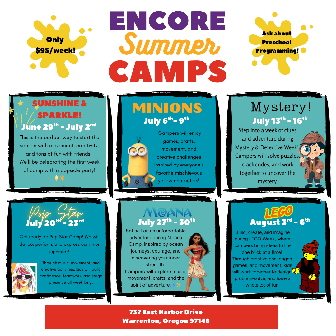 Encore Summer Camps are packed with movement, creativity, and nonstop fun! Each themed week blends dance, games, crafts, music, and imagination in a high-energy, positive environment where kids can build confidence, make new friends, and express themselves.